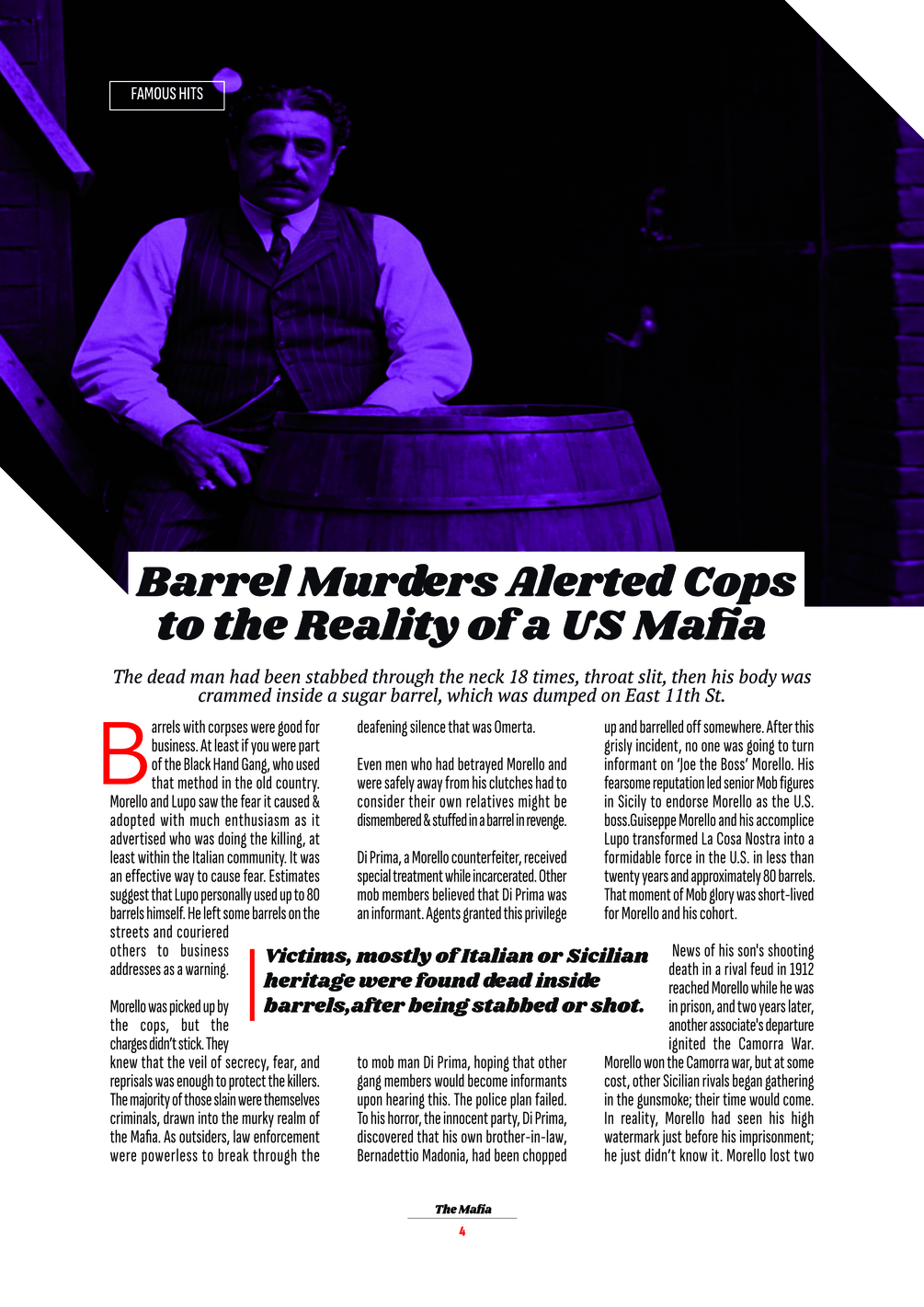 New York at the turn of the century , a series of grisly murders take place where the victims are stuffed into barrels. Secret Service agents close in on a man of interest - a master forger & leader of the Corleonesi - Guiseppe Morello.